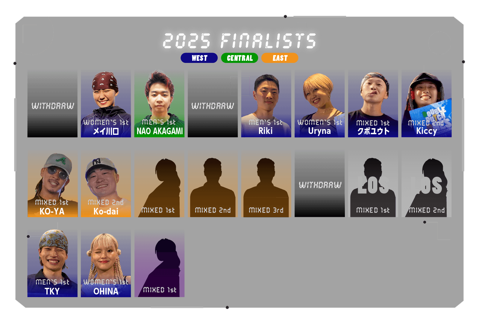 ■ 概要 男女混合で実施し、トーナメントで1位・2位の選手をFINALISTとする。 日 程:2025年 7月20日(日) 時 間:11:00〜17:30 *予定 会 場:spot. Yoyogi Park 参加費:〜大学生 ¥3,000 / 社会人 ¥3,500 ※日時については変更の可能性となるため、開催直前のSNS等での発信をご確認ください。 ■ 予選ルール ※SCENE 5より予選形式が変更となっています。 実施形式:男女混合 オーディション形式 ターナー:固定 (主催側が用意したターナー) 進出人数:16名 ※エントリー人数 15名以下の場合は8名 ■ 本戦ルール 対戦方式:男女混合 トーナメント戦 ムーヴ数:各1分以内 延長戦 :30秒 ターナー:固定 (主催側が用意したターナー) 審査方法:1ムーヴずつ行い、ラウンドごとに審査員のフラッグによってジャッジ。2回先取で勝利。 先攻後攻:指定無し (各予選の時間の関係上、予め先攻後攻が決まる場合もございます) ■ 選曲 DJによるランダム選曲 ■ 反則内容 ・タイムオーバー ・スポーツマンシップに欠ける行為 ・危険な技、または審査員が危険と判断する技を行った場合 ・観客に向かっての危険行為 ・小道具の使用 ・跳び手、回し手の邪魔になる行為は禁止 |